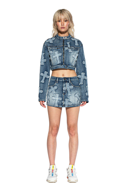 CROSS PATCH DENIM MINI SKIRT